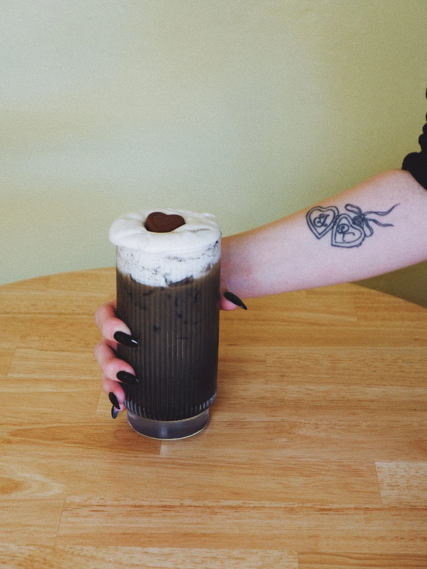 iced latte | white chocolate + activated charcoal, house-made cream cheese cold foam, chocolate heart